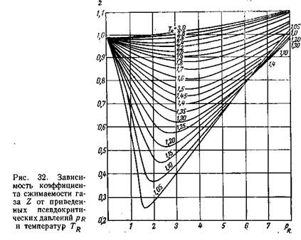 При этом он непосредственно зависит от величин пластовых давления (в Па) и температуры (в К) — Z = 0,00289 (рпл/Та11) X X (Vaa/Vor). Величину коэффициента сжимаемости чаще всего определяют по экспериментальным кривым (рис. 32). На рис. 32 значения этого коэффициента даны в зависимости от приведенных псевдокритических давлений и температур. Псевдокритическими давлением и температурой называют суммы средних взвешенных критических значений соответственно давлений и температур отдельных углеводородов, из которых состоит смесь. Критической называется такая температура, выше которой газ не может превратиться в жидкость, критическим называется давление, которое соответствует точке перехода газа в жидкость (табл. 2). Под приведенными псевдокритическими давлением и температурой понимают отношение рабочих абсолютных давлений и температур соответственно к псевдокритическим значениям давления и температуры для данного состава газа. Пример расчета псевдокритических давлений и температур приведен в табл. 3. Зная пластовое давление и температуру, можно определить приведенные псевдокритические давление ря и температуру TR по формулам: pR = рал/рг; TR = ТПП/ТГ, где Рпл — пластовое давление, МПа; Тпл — абсолютная температура газовой смеси в пластовых условиях, равная Т0 + ^пл (Т0 = 273 К, ^Пл — пластовая температура, °С); рг — псевдокри- Date: 2015-06-08; view: 864; Нарушение авторских прав |