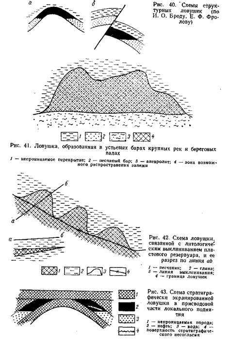 К резервуарам, литологически ограниченным со всех сторон, относятся природные резервуары, в которых участки проницаемых пород окружены со всех сторон практически непроницаемыми породами (рис. 39). Ловушки нефти и газа Ловушками нефти и газа называются природные резервуары или их части, в которых благодаря различного рода структурным дислокациям, стратиграфическому и литологическому экранированию и литологическому ограничению создаются условия для скопления нефти и газа. , Ловушки, связанные с различного рода структурными дислокациями, называют структурными. Стратиграфически экранированные и литологически ограниченные ловушки относят к неантиклинальным ловушкам. Наиболее распространены структурные ловушки, связанные с различного рода складками, структурами уплотнения, облекания, с диапирами. В этом случае ловушки приурочены к сводам складок и поднятий (рис. 40, а). Складки могут быть самыми различными— от пологих куполов до сильно вытянутых брахиантиклиналей с симметричными крыльями. Размеры сводовых ловушек изменяются в широких пределах: от единиц до нескольких тысяч квадратных километров. Тектонические нарушения типа сбросов, взбросов и надвигов обусловливают образование тектонически экранированных ловушек (рис. 40, б), в которых пластовый резервуар экранируется поверхностью нарушения. Образование неантиклинальных ловушек может быть связано с процессами осадконакопления и денудации, причем в процессе формирования ряда седиментационных и денудационных ловушек вполне определенную роль играют тектонические процессы. Седиментационные ловушки могут быть нескольких типов: в береговых валах, дельтовые и баровые (рис. 41); русловые (см. рис. 49); рифовые (см. рис. 48, в). Кроме того, седимента-ционные ловушки могут быть связаны с линзами песчаника среди непроницаемых пород. Наряду с указанными к седиментационным относят также ловушки, связанные с зонами выклинивания пластовых резервуаров (рис. 42). В тектоническом плане эти зоны приурочены к моноклиналям, периклинальным окончаниям складок, а также к прогибам между выступами. Роль тектонического фактора в формировании этих ловушек очевидна. Денудационные ловушки без влияния тектонического фактора могут формироваться в результате перекрытия непроницаемыми породами эрозионных останцев (см. рис. 48, б). Однако среди денудационных ловушек широко распространены денудационно-структурные, называемые стратиграфически экранированными. В этих ловушках экранами служат поверхности древных страти-