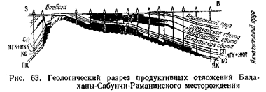 ние на три участка, различных по условиям нефтегазонасыщения. На юго-западном поле нефтегазоносны все свиты нижнего отдела продуктивной толщи, на северо-восточном — свиты от сураханской до калинской, на своде — только калинская свита. Балаханы-Сабунчи-Раманинское месторождение (рис. 63) связано с крупной антиклинальной складкой. Наиболее приподнятая ее часть поражена грязевым вулканом, вокруг которого обнажаются породы кирмакинской свиты. Вдоль свода складки протягивается основной сброс, разделяющий месторождение на два изолированных участка. В разрезе отложений от апшеронских до кирмакинских выделяется до 30 нефтеносных горизонтов. Основными по запасам являются залежь горизонта V балаханской свиты и залежь подкирмакинской свиты. стую (НКП), надкирмакинскую глинистую (НКГ). Средний отдел соответствует свите перерыва, а верхний — балаханской, сабун-чинской и сураханской свитам. Наибольшее число залежей нефти и газа установлено в разрезе подкирмакинской и кирмакинской свит. Нефти бессернистые или малосернистые (до 0,5 % серы), смолистые или высокосмолистые, беспарафинистые или слабопара-финистые. Газы метановые (90—98 %) с содержанием значительного количества конденсата (215—280 г/м3). Месторождения нефти и газа — наибольшее их число (около 50 %) открыто в Апшеронском районе и связано с брахиантиклинальными и куполовидными складками, в строении которых принимают участие в основном отложения продуктивной толщи. Для месторождений характерны сильная нарушен-ность дизъюнктивами, часто диапировое строение и осложнение грязевыми вулканами. Система нарушений делит месторождения на отдельные тектонические блоки. Наибольшее значение в распределении нефтегазоносности по разрезу имеет продольная система нарушений, распространенная, как правило, в нижнем отделе продуктивной толщи. Месторождение Нефтяные Камни (рис. 62) приурочено к бра-хиантиклинальной складке. Продуктивная толща на своде складки размыта до кирмакинской свиты. В ее разрезе выделяется до 23 нефтегазоносных горизонтов. Нарушения разбивают месторожде-148 Date: 2015-06-08; view: 938; Нарушение авторских прав |