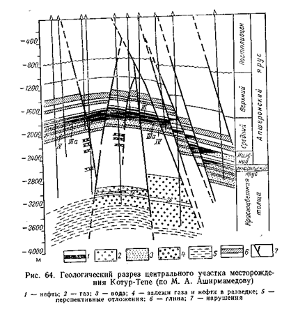 Промышленная газоносность Западной Туркмении установлена в 1952 г., когда было открыто первое газоконденсатное месторождение Кызылкум. Основные черты геологического строения. Западно-Туркменская газонефтеносная область в тектоническом отношении соответствует одноименной межгорной впадине. На севере впадину обрамляют горные сооружения Большого и Малого Балхана, на востоке — Копет-Дага и на юге — Эльбруса. Мезозойские и частично палеогеновые образования обнажаются в обрамляющих впадину горных сооружениях, а в самой впадине погружаются на значительную глубину (6—12 км). Неоген представлен отложениями красноцветной толщи (средний плиоцен), акчагыльского и апшеронского ярусов (верхний плиоцен) и постплиоцена. Отложения красноцветной толщи выражены, монотонным и частым чередованием песчано-алевролитовых и глинистых отложений, резко изменчивых по площади. Общая мощность толщи около 2500 м. В направлении обрамления впадины отложения красноцветной толщи выклиниваются. В пределах впадины выделяются две основные зоны поднятий — Прибалханская и Гограньдаг-Окаремская, разделенные глубоким Кызылкумским прогибом. К указанным зонам приурочены все известные месторождения нефти и газа. Прибалхан- екая зона поднятии протягивается в северной части впадины. Она включает серию кулисообразно сочленяющихся субширотных брахиантиклинальных складок, сильно нарушенных, особенно в присводовой части, сбросами. Наиболее крупные складки приурочены к западной части зоны (Котур-Тепе и др.). Складки Гог-раньдаг-Окаремской зоны поднятий преимущественно пологие, с широкими сводами, сравнительно небольшие по амплитуде (150—500 м), значительно менее осложнены разрывными нарушениями. Широко развиты грязевые вулканы, связанные с разломами преимущественно меридионального простирания. Нефтегазо косность — апшеронские и акчагыль-ские отложения в основном продуктивны на месторождениях восточной части Прибалханской зоны поднятий. Дебиты нефти в скважинах 25—150 т/сут. Отложения верхней части красно-цветной толщи содержат основные залежи нефти иногда с обширными газовыми шапками. Коллекторские свойства песчаников высокие. Дебиты нефти 500—800 т/сут, газа — 300—600 тыс. м3/сут. Нижняя часть красноцветных отложений представлена более глинистыми, с худшими коллекторскими свойствами, преимущественно газоносными породами. Из этих горизонтов также получены промышленные притоки нефти дебитами до 200 т/сут. Нефти практически бессернистые, в основном парафинистые или высокопарафинистые, смолистые, легкие. Плотность нефтей, изменяясь в довольно широких пределах, уменьшается с глубиной. Свободные газы — метановые (92—96 %), с незначительным содержанием углекислоты и азота. В газе присутствует большое количество конденсата (500—600 см3/м3). Месторождения нефти и газа расположены главным образом в Прибалханской зоне поднятий. Все месторождения многопластовые; залежи нефти и газа в основном пластовые тектонически экранированные и пластовые сводовые, разбитые на мелкие блоки. Меньше развиты литологически ограниченные залежи. Месторождение Котур-Тепе (рис. 64) приурочено к крупной брахиантиклинальной складке субширотного простирания. Складка асимметричная, с крутым северным (15—30°) и более пологим южным (5—10°) крыльями, разбита множеством сбросов с амплитудами от 15