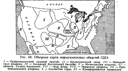 лого столетия, когда в 1859 г. в США на северо-западе шт. Пенсильвания рядом с нефтяным источником была пробурена скважина и с глубины 21 м ударил фонтан нефти. С конца XIX в. нефтедобывающая промышленность успешно начала развиваться не только в Северной Америке, но и на других континентах мира. Газовая промышленность относительно молодая. В 40-х гг. XX в. газ добывался в ничтожно малом количестве. Последние десятилетия нашего века характеризуются интенсивным^ развитием нефтяной промышленности во всем мире. Высокий уровень добычи нефти и газа ставит перед нефтедобывающими странами проблему восполнения отобранных из недр запасов. В связи с этим продолжается увеличение объемов поисково-разведочных работ. В последние годы поиски нефти и газа ведутся не только на суше, но и в акваториях морей и океанов. Месторождения нефти и газа открыты в Мексиканском заливе, Карибском море, у берегов Калифорнии и Аляски, в Северном море, Персидском заливе, у берегов Австралии и др. В настоящем учебнике дана краткая характеристика наиболее крупных нефтегазодобывающих районов мира: США, Ближнего и Среднего Востока и Северной Африки. Соединенные Штаты Америки В восточной и северной частях Северо-Американской платформы осадочный чехол сложен преимущественно палеозойскими отложениями, а в юго-западной и южной частях — мезозойско-кайнозойскими. На востоке древней Северо-Американской платформы вдоль Аппалачских гор протягивается очень глубокий Предаппалачский краевой прогиб (рис. 68). С запада он ограничен Цинциннатским сводом. Западнее последнего выделяются Мичиганская и Илли-нойская впадины. Далее на запад располагается Западный Внутренний каменноугольный бассейн, ограниченный с юга областью структур системы Уичита-Амарилло. Далее на юг выделяется глубокопогруженная Пермская впадина, ограниченная на востоке сводом Бенд. На северо-западе Северо-Американской платформы располагаются эпиплатформенные орогенические области Скалистых гор, а на юго-востоке — Примексиканская впадина. Западнее Кордильер находится Калифорнийская нефтегазоносная провинция. В пределах древней Северо-Американской платформы крупнейшей нефтегазоносной областью следует считать Западный Внутренний бассейн. Большинство месторождений нефти и газа приурочено к локальным поднятиям на погребенных гранитных кряжах и крупных приподнятых блоках, к погребенным останкам древнего рельефа и к стратиграфическим и литологическим ловушкам. Большие скопления нефти выявлены в Примексиканской впадине. Общая мощность мезозойско-кайнозойских отложений в пределах впадины превышает 10 000 м. Месторождения известны в области развития как солянокупольных, так и антиклинальных структур, приуроченных к региональным разломам и погребенным сводовым поднятиям и валам. Здесь также открыто значительное число залежей в литолого-стратиграфических ловушках. Всего в этой провинции известно более 1000 месторождений. Среди них крупнейшее в мире месторождение нефти Ист-Тексас. Месторождение Ист-Тексас (рис. 69) открыто в 1930 г. Оно расположено в крупной нефтегазоносной впадине Галф-Кост, дугообразно окаймляющей с севера Мексиканский залив, и приурочено к западному борту крупного поднятия Сабин. Скопления нефти обнаружены в песчаниках Вудбайн верхнемелового возраста, наклоненных от поднятия С