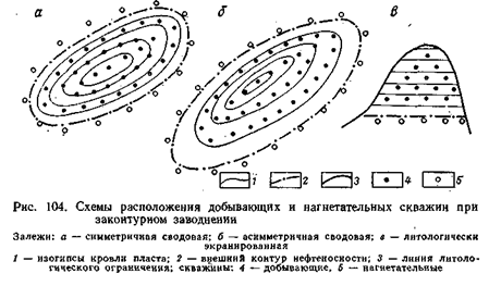В настоящее время в СССР большинство залежей со значительными запасами нефти разрабатываются с заводнением, обеспечивающим поддержание пластового давления. Поддержание пластового давления осуществляется путем закачки в пласт преимущественно воды. При этом залежь в соответствии с проектом разбуривается сеткой добывающих и нагнетательных скважин. В технологическом плане такая залежь представляет собой объект разработки. Одним объектом разработки будут являться и несколько продуктивных пластов, разрабатываемых одной сеткой скважин. Вид заводнения на объекте разработки выбирается в зависимости от геологического строения продуктивного пласта в нефтяной и законтурных его частях, вязкости нефти и других ее свойств, естественного режима залежи и т. п. Закачка воды производится в законтурную или приконтурную часть нефтяной залежи или непосредственно в нефтяную залежь. В зависимости от этого выделяют законтурное и внутриконтурное заводнение. Система разработки с законтурным заводнением. Основным условием успешного применения систем разработки с законтурным заводнением является наличие хорошей гидродинамической связи между нефтеносной и водоносной частями пласта на контуре залежи. Обычно разработка с законтурным заводнением применяется для залежей нефти с естественным упруго-водонапорным режимом. Добывающие скважины при системе разработки с законтурным заводнением располагаются рядами вдоль внутреннего контура нефтеносности, причем скважины каждого последующего ряда смещаются по отношению к скважинам предыдущего ряда на половину принятого расстояния между добывающими скважинами. Последний ряд скважин должен располагаться в самой повышенной части залежи (рис. 104, а). При разработке пластовых сводовых залежей, приуроченных к асимметричным складкам, на пологом крыле размещается больше рядов добывающих скважин, чем на крутом (рис. 104, б). При разработке литологически экранированных залежей нагнетательные скважины располагаются вдоль водонефтяного контакта (рис. 104, в). Расстояние между скважинами в рядах принимается меньшим, чем расстояние между рядами. Этим обеспечивается более равномерное стягивание контура нефтеносности. В Волго-Уральской и Западно-Сибирской нефтегазоносных провинциях применяют расстояния между скважинами 300—500 м, а между рядами 500—800 м. Нагнетательные скважины располагают в непосредственной близости от контура нефтеносности (200—300 м), а во