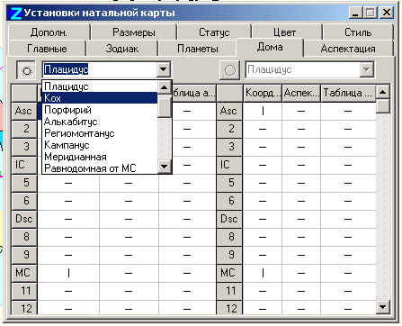 В хуберовской астрологии, могут применяться только дома Коха. Эту систему также нужно выбрать в настройках ZET 7. Для этого повторяем все также, как в случае с аспектами, только в окне настроек (см. рисунок) выбираем вкладку «Дома». Вменю выбираем «Кох». Почему именно эту систему? Можно долго рассуждать на эту тему. Но основной причиной является то что автор метода работал именно с ней и если мы хоти получить сходные результаты, нужно сделать все настройки соответствующими. Это вторая по популярности система после Плацидуса. С научной точки зрения, в системе Коха куспиды промежуточных домов (2, 3, 4, 6, 8, 9, 11, 12) рассчитываются относительно места рождения, тогда как в других системах, например Плацидуса - относительно центра Земли.