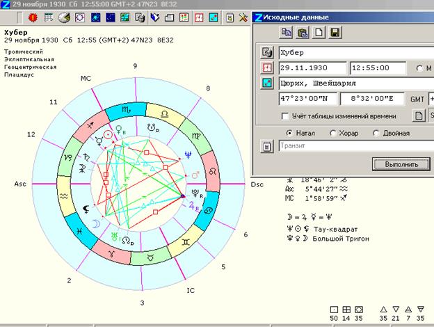 Люди с треугольными аспектными фигурами всегда в движении. У них наиболее выражен принцип подвижного, или мутабельного, креста. Их основная мотивация, стимул в жизни - поиск любви, человеческого контакта, познания. Такие люди стремятся открывать для себя соответствия между внутренним и внешним - между вещами и их внутренним смыслом, потому что им важно постичь значение и суть всех вещей. Они любят учиться и входить в новые ситуации, восприимчивы и имеют множество интересов. Вопросы, которые эти люди себе задают, таковы: "Почему это именно так? Почему мне нужно делать это? Почему я должен так страдать?" Он хотят познать значение и смысл вещей, чтобы отождествиться с ними, стремятся быть в контакте со всем сущим, чтобы добыть внутренние сокровища - благо, добро, красоту. Треугольные аспектные фигуры в карте рождения побуждают с радостью встречать новые обстоятельства и людей - это шанс достигнуть нового понимания. Ибо людям с такой картой свойственно стремиться понять основные законы творения и их проявления в мире. Многие из них глубоко интересуются психологическими и социальными проблемами, состоянием практической жизни. Такие люди чувствуют призвание помогать, исцелять, служить. Их притягивает все, что можно усовершенствовать, что позволяет создать более полноценный образ действия. Они не склонны действовать утилитарно, функционально; чтобы привлечь их, следует обращаться к их любознательности и интеллекту. Стабильность, определенность, рутина - не для них; их среда - прогресс, развитие, рост. Луна - планета, наиболее родственная треугольным фигурам аспектов. Рис 2. Для наглядной демонстрации Бруно Хубер приводит свои данные 29.11.1930, 12ч. 55мин., Цюрих. (треугольная структура)