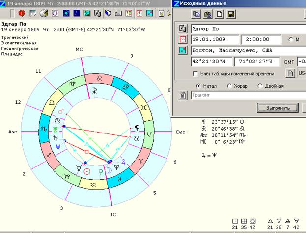 Линейные структуры состоят из разрозненных линий. Они соответствуют кардинальному принципу. "Линейные" люди настроены на то, чтобы наилучшим образом достигать своих целей в жизни. Они непрестанно ищут новые пути к возвышению, к первенству. Эти люди беспокойны, динамичны и всегда к чему-то стремятся. Они любят рисковать и обладают изрядной силой воли, но настойчивость и осмотрительность - не их достоинства. Они всегда движутся сразу к нескольким целям, поэтому нередко растрачивают силы впустую. Их окрыляет надежда совершить что-то выдающееся. Такие люди любят и способны быть оригинальными, им ведомы гениальные озарения и состояния высочайшей творческой активности. Но успех их непрочен: они теряют заряд, отвлекаются, их интерес гаснет так же быстро, как вспыхивает. Для "линейных" личностей характерна переоценка собственных достоинств, что ведет к триумфам, но также к неудачам, перепадам настроения и неуверенности. Они азартны и могут ради одного шанса рискнуть всем. Они обожают начинать что-то новое и не очень-то любят заботиться о каждодневных нуждах в отличие от личности "четырехугольного" типа. Солнце - наиболее родственная линейным структурам планета. Рис 3. Карта Эдгара По. 19.01.1809, 2ч. 00мин., Бостон, Массачусетс.(линейная структура)