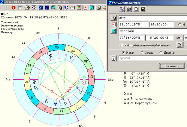 Следует тщательно изучить планеты, составляющие аспектные фигуры. Например, в какой-то фигуре может доминировать одна из трех главных планет - Солнце, Луна или Сатурн. Тогда энергия этой планеты определит базовую мотивацию в соответствующей области. Наличие двух-трех аспектных фигур в карте может объяснить, например, то, что человек дома мягок и уступчив, на работе наводит страх на подчиненных, а в духовных вопросах чувствует себя неуверенно и старается держаться от них подальше. Таким образом, он имеет три разных стиля поведения, основанных на различных установках. Естественно, это влияет на интеграцию или дезинтеграцию его личности. С точки зрения психосинтеза, наличие нескольких несвязанных аспектных фигур означает внутренний импульс к работе над интеграцией сознания. Пока мы не осознаем самих себя, он давит на нас изнутри и может даже привести к болезни. По мере роста самосознания мы все более становимся способны использовать это внутреннее напряжение творчески и активно работать над достижением синтеза. Примером может служить карта психолога Карла-Густава Юнга (рис. 5). В гороскопе Юнга имеются две отдельные аспектные фигуры. Первая - большой четырехугольник, образованный Плутоном, Юпитером, Марсом и Сатурном. Он тяготеет к ASC и потому указывает на склонность Юнга к интроверсии, особенно в юности и затем снова в зрелые годы. Соединение Луны с Плутоном имеет большой орбис и образует хрупкую связь со второй фигурой, имеющей форму ножниц, от Луны к Урану, затем к Северному узлу, оттуда к соединению Венеры с Меркурием, а также к Солнцу, находящемуся в квадрате с Нептуном. Эта конфигурация показывает совершенно иную сторону личности Юнга - его экстравертированную, тщеславную "львиную" натуру, которая делала его зависимым от общественного признания.