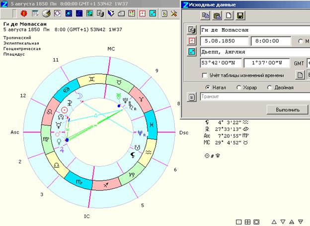 Рис. 8. Зелено-голубая аспектная структура. Карта Ги де Мопассана. 05.08.1850, 8ч. 00 мин., Дьепп.