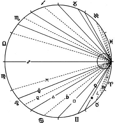 Мы переходим к рассмотрению дуговых аспектов, характеризуемых определенной дугой между чувствительными точками гороскопа (в отличие от аспектов положения, означающих принадлежность чувствительной точки определенному знаку или дому). Вообще в гороскопе имеется большое количество чувствительных точек: это планеты, узлы планет, вершины домов, парсы (арабские части) и т. д. Этих точек и, соответственно, дуговых аспектов, в гороскопе очень много, и все они, безусловно, несут определенную информацию. Однако начинающему астрологу лучше ограничиться наиболее важными чувствительными точками карты: планетами, узлами Луны, асцендентом и зенитом и мажорными аспектами между ними, то есть соединением, секстилем, квадратом, трином и оппозицией, поскольку в большинстве случаев именно они дают основной рисунок расстановки сил во внешних обстоятельствах и внутренней жизни человека. Всюду далее рассматриваются только дуговые аспекты, поэтому соответствующий эпитет будет опускаться. Вообще наличие аспекта между планетами означает интимную связь их принципов в жизни человека: включение одной из планет ведет к активизации другой и определенному (видом аспекта) взаимодействию между ними. Возможны ли чисто социальные отношения между мужчиной и женщиной? Человек, у которого Венера и Луна не находятся в аспекте, скорее всего ответит: да, конечно. Для него социальные отношения и влюбленность это одно, а собственно сексуальные и семейные отношения - совершенно другое. Наоборот, для человека, у которого Венера и Луна стоят в мажорном аспекте, тесные социальные отношения, влюбленность, секс и домашние отношения идут как бы одним пакетом: для него естественно, познакомившись с девушкой на концерте, позвать ее домой, приготовить ужин, накормить и предложить переночевать в одной постели. От вида аспекта и уровня его проработки зависит, насколько гармонично и конструктивно будут происходить конкретные взаимодействия, но в любом случае интимные и, в частности, сексуальные моменты в отношениях с противоположным полом у этого человека будут возникать гораздо чаще, чем при отсутствии аспекта между Луной и Венерой. Другой пример - отношения Марса и Сатурна. Если эти планеты не находятся в аспекте, принципы энергии и агрессии, с одной стороны, и жесткости, дисциплины, ограничения и самоуглубления, с другой, не будут непосредственно связаны друг с другом ни во внешней, ни во внутренней жизни человека. Эти планеты проявляются, как правило, в разное время: лишняя осторожность, предусмотрительность и скепсис не расхолаживают человека в моменты буйства и самозабвенного труда, а в периоды самоуглубления и внутренней концентрации нет излишнего энтузиазма и активных внешних помех. Это дает определенную свободу, но также и задержку в приобретении необходимого жизненного опыта. Другими словами, закон кармы, воздающий за деструктивную внешнюю активность обратным ударом и ограничениями, будет в данном случае действовать косвенно и часто через некоторое время; и, наоборот, добровольное самоограничение, выработка терпения, дисциплины и мудрости далеко не сразу принесут плоды в виде усиления энергетики и возможностей активной конструктивной деятельности. Если же Марс и Сатурн стоят в мажорном аспекте, то активизация Марса, то есть увеличение внешней или внутр