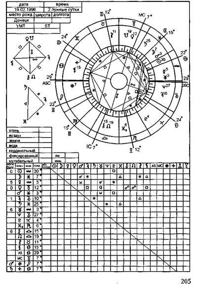 В VIII доме Солнце в королевском градусе (30° Водо- лея), Марс и Луна. Солнце и Марс — промиссоры, Луна — слабый интерфактор (43/-2).