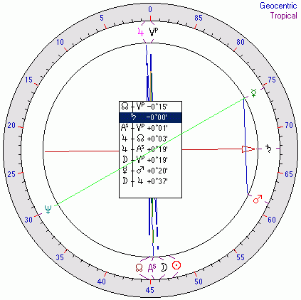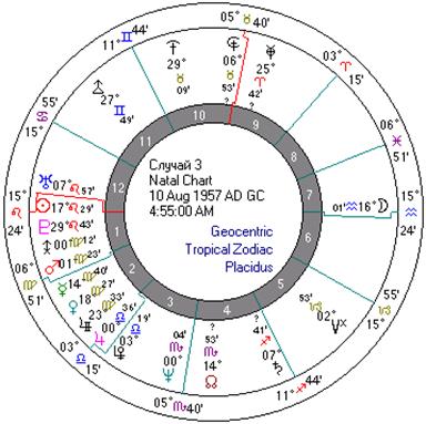 Представляется, что шизофрения зачастую уходит корнями в искаженные представления о религии и сексе. Планетарная картина, отражающая религиозный идеализм, Юпитер/Посейдон, приходится на комбинацию, указывающую на психическое заболевание: Гадес + Зевс - Луна. Основная комбинация, символизирующая сексуальные отношения, Марс + Венера - Купидон, находится во взаимодействии с натальной Луной и осью Марс/Нептун, что говорит о деструктивной тенденции в этой области. Том сомневается в своей потенции и боится сексуальных отношений. Скрытым препятствием в этой ситуации может быть страх перед совершением смертного греха. Осознание своего бессилия заставляет его мучительно страдать. Тем не менее, психическое расстройство не затронуло интеллект Тома в целом. Как у большинства шизофреников IQ (коэффициент интеллекта) Тома гораздо выше среднего. Он достаточно проницателен и восприимчив, когда приходится анализировать мотивы окружающих, хотя другая часть его существа стремится игнорировать доводы разума при общении с людьми. Он боится конфронтации, так что скорее покорится, нежели рискнет пробудить гнев. Средняя точка МС/Адмет совпадает с положением Нептуна, что интерпретируется как "неумение обманывать, тактичность..." Том считает себя трусом. Натальный Сатурн совпадает со средней точкой Марс/Меркурий и образует полуоктиль с Асцендентом, что свидетельствует о поражении Асцендента. Октиль Юпитера к Асценденту рождает потребность нравиться людям, в то время как семиоктиль Сатурна пробуждает страх быть отвергнутым. Поскольку все эти комбинации связаны с формулой шизофрении, Сатурн + Нептун - Меркурий, можно заключить, что ранние опыты, связанные с принятием и отвержением, совпали с началом его заболевания. Нельзя сказать, что упомянутые факторы послужили причиной заболевания, скорее они стимулировали проявление скрытой предрасположенности. Влияние эгоцентричного Льва на Асцендент и Солнце располагает Тома к сильной сосредоточенности на самом себе. Сложности в общении с окружающими (проблема, присущая всем шизофреникам), без сомнения, частично обусловлены этим подавляющим интересом к себе, оставляющим мало, или вовсе не оставляющим места для других людей в его сознании. Это могло бы быть преодолено по достижении Томом лет тридцати или около того, когда прогрессивное Солнце образует соединение с его натальной Венерой, находящейся в Деве. Венера карты солнечных дуг к тому времени образует трин к натальной Луне Тома в VII доме, символизирующим женитьбу и партнерские отношения. Психическое состояние Тома уже в значительной мере улучшилось благодаря приему соответствующих лекарств. Возможно, к тридцати годам его состояние стабилизируется настолько, что он сможет построить значимые для него отношения с молодой женщиной. Этому будет способствовать транзитный Сатурн, который вернется на свое изначальное место возле куспида V дома, дома романтики и любовных отношений. Его трин к натальному Урану, управителю VII дома женитьбы, может принести Тому счастливую любовную связь. В настоящее время трудноразрешимым является вопрос о карьере. Как большинство людей, страдающих заболеванием подобного рода, Том неспособен сосредоточить внимание на овладении какой-либо профессией, так же как не может заниматься поденной работой. Тем не менее, пр