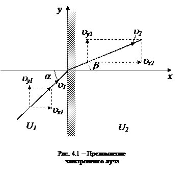 При движении электрона через границу двух сред с различными потенциалами (рис. 4.1) составляющая скорости, параллельная поверхности раздела, остается без изменения, а составляющая, перпендикулярная этой поверхности, изменяется по величине (увеличивается при U2 > U1). Равенство составляющих скоростей uy1 и uу2 можно записать в виде u1 sina = u2 sinb. Если электрон влетает в область потенциала U 1 c нулевой начальной скоростью, то, учитывая, что скорость определяется величиной электрического поля, можно записать: