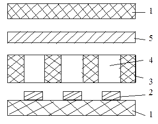Рис. 6.4 – ГИП постоянного тока: 1 – подложки прозрачные, диэлектрические; 2 – катоды в виде полос металла, нанесенных на подложки распылением; 3 – диэлектрическая матрица; 4 – отверстия связи; 5 – полоски металла - аноды