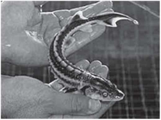 Рис. 44. Малёк русского осетра Строение парных и непарных плавников приближается к дефинитивному. Жаберные крышки разрастаются, полностью покрывая жаберные лепестки. В отличие от личинок челюсти малька не имеют зубов. Рот малька выдвигается в виде трубки. Зубы исчезают тогда, когда жаберные крышки начинают функционировать как всасывающий аппарат. При этом утрачивается необходимость удерживать добычу зубами. Питание бентосом.