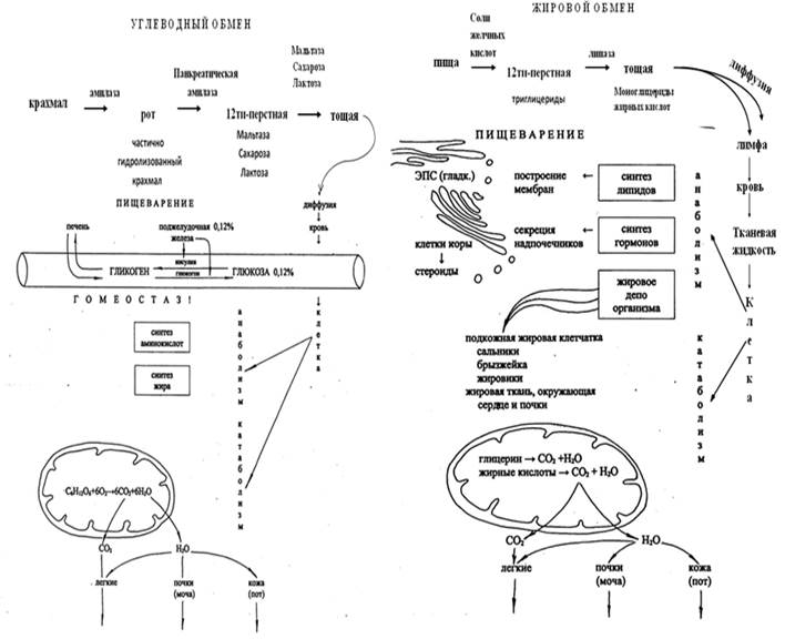 Аминокислоты, из которых состоят белки, соединяются между собой в разнообразной последовательности и образуют чрезвычайно большое количество разного строения белков. В клетке белки используются для построения всех ее структурных элементов, поэтому белковая пища очень нужна растущему организму. Углеводы - основной источникэнергии в организме. В крови человека концентрация глюкозы поддерживается на постоянном уровне гормонами поджелудочной железы. Жиры входят в состав мембран, являются источником энергии и жирорастворимых витаминов, защищают организм от потери тепла. Часть запасного жира может поступить в кровь, расщепиться на глицерин и жирные кислоты и попасть в печень, где они превратятся в гликоген. Между жировым и углеводным обменом есть взаимосвязь.