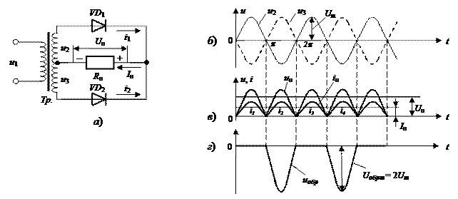 Рис. 3. Однофазный двухполупериодный выпрямитель с нулевым проводом