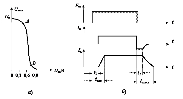 Рис. 4. Передаточная характеристика (а) и временные зависимости токов базы и коллектора транзистора (б) в ключевом режиме