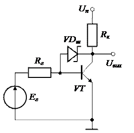 При поступлении импульса положительной полярности генератора ЕГ на базу транзистора, находящегося в состоянии отсечки, вначале происходит заряд входной емкости и емкостей коллекторного и эмиттерного переходов. Поэтому ток базы начинает протекать с запаздыванием на время t1 (Рис. 4,б). По мере накопления носителей в области базы происходит нарастание тока коллектора, который достигает к моменту tвкл значения тока насыщения. В момент отрицательного перепада напряжения на базе ток базы протекает в обратном направлении и в течение времени t2 происходит рассасывание избыточного заряда в области базы. После выхода транзистора из насыщения ток коллектора снижается пропорционально уменьшению тока базы. Через промежуток времени tвыкл транзистор закрывается, переходя в состояние отсечки. Таким образом в ключевом режиме работы транзистора задержка включения tвкл обусловлена временем заряда входной емкости и емкостей коллекторного и эмиттерного переходов t1 и процессом накопления заряда в базовой области. При достаточно большой мощности входного сигнала транзистор переходит из первоначального состояния отсечки тока коллектора в состояние насыщения. В процессе закрывания транзистора отрицательным перепадом напряжения происходит обратный процесс – вначале за время t2 происходит рассасывание носителей в области базы током обратной полярности, а затем снижение тока коллектора и переход транзистора в состояние отсечки. Процессы накопления и рассасывания заряда при переключении транзистора значительно снижают скорость переключения транзистора, ухудшая его динамические качества. Чтобы повысить быстродействие транзистора в ключевом режиме стремятся использовать активный режим работы транзистора, исключающий состояние насыщения. Для этого между коллектором и базой включают диод Шоттки (Рис. 5). Особенностью перехода Шоттки является малое падение напряжения на нем в открытом состоянии (0,3 - 0,4 В) и отсутствие накопления заряда, а значит и барьерной емкости в выпрямляющем переходе металл-полупроводник, а диффузионная емкость не превышает 1 пФ. При достижении напряжения база-эмиттер значений 0,7 - 0,8 В диод Шоттки открывается и напряжение на переходе база-коллектор ограничивается на уровне 0,35 - 0,4 В.
