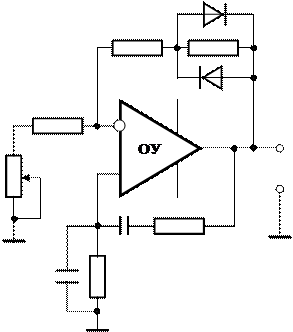 где Z6 = R 6½½ Rg 1½½ Rg 2, а Rg 1, Rg 2 – дифференциальные сопротивления диодов. Соображения по выбору параметров делителя напряжения R 1, R 2, R 5, R 6 аналогичны рассмотренным ранее при расчёте параметров схемы инвертирующего усилителя. Например, суммарное значение R 1 + R 2 можно выбрать в пределах 1,5…3 кОм, значение R 6 порядка 510 Ом…1 кОм, дифференциальное сопротивление диодов D 1 и D 2 должно иметь значение порядка 40…400 Ом в зависимости от амплитуды колебаний. Включение резистора R 6 параллельно диодам D 1 и D 2 несколько улучшает форму гармонических колебаний. С этой точки зрения схема на рис. 4, б позволяет получить меньший коэффициент гармоник выходного напряжения генератора, благодаря тепловой инерции нити накаливания лампочки EL.