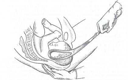 Передний вид затылочного предлежания. Внутренний поворот головки завершен. Головка плода находится на тазовом дне. Стреловидный шов располагается в прямом размере выхода малого таза, малый родничок расположен спереди у лона, крестцовая впадина полностью выполнена головкой плода, седалищные ости не достигают. Щипцы накладывают в поперечном размере таза. Рукоятки щипцов расположены горизонтально. В направлении книзу кзади производят тракции до тех пор, пока из-под лона не родится затылочный бугор, затем головку разгибают и выводят.