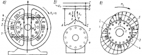 Принцип действия асинхронного двигателя Асинхронный двигатель состоит из неподвижной части статора 1 (рис.1, а), на котором расположены обмотка 2 статора, и вращающейся части — ротора 3 с обмоткой 4. Между ротором и статором имеется воздушный зазор, который для улучшения магнитной связи между обмотками делают по возможности малым. Обмотка 2 статора представляет собой трехфазную или в общем случае многофазную обмотку, катушки которой размещают равномерно вдоль окружности статора. Фазы этой обмотки А-Х, B-Y и C-Z размещены равномерно по окружности статора; они соединяются «звездой» (рис.1,б) или «треугольником» и подключаются к сети трехфазного тока. Обмотку 4 размещают равномерно вдоль окружности ротора. При работе двигателя она замкнута накоротко.