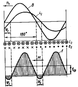 Рис.5. Энергетическая диаграмма асинхронного двигателя При работе двигателя под нагрузкой по обмоткам его статора и ротора проходят токи i1 и i2. Частота тока в обмотках статора f1 и ротора f2 определяется частотой пересечения вращающимся магнитным полем проводников соответствующей обмотки. Обмотка статора пересекается магнитным полем с частотой n1, а обмотка вращающегося ротора — с частотой n1 — n. Следовательно, f2/f1 = (n1- n)/n1= s или f2 = f1s (3) Передача электрической энергии из статора в ротор происходит так же, как и в трансформаторе. Двигатель потребляет из сети электрическую мощность Pэл = 3U1I1cos?1 и отдает приводимому им во вращение механизму механическую мощность Рмх (рис. 5). В процессе преобразования энергии в машине имеют место потери мощности: электрические в обмотках статора?Рэл1 и ротора?Рэл2, магнитные?Рм от гистерезиса и вихревых токов в ферромагнитных частях машины и механические?Рмх от трения в подшипниках и вращающихся частей о воздух. Из статора в ротор вращающимся электромагнитным полем передается электромагнитная мощность Pэм роторе она превращается в механическую мощность ротора Р’мх. Полезная механическая мощность на валу двигателя Pмх меньше мощности Р’мх на значение потерь мощности на трение?Рмх. При возрастании механической нагрузки на валу двигателя увеличивается ток I2. В соответствии с этим возрастает и ток I1 в обмотке статора. M = cмФтI2 cos?2 (4) где Фт — амплитуда магнитного потока, созданного обмоткой статора; cм — постоянная, определяемая конструктивными параметрами данной машины и не зависящая от режима ее работы. Поясним физический смысл формулы (4). На рис.6 изображен ротор двухполюсного асинхронного двигателя в развернутом виде, на котором кружками показаны поперечные сечения проводников. Крестики и точки внутри проводников обозначают направление в них тока i2, а под проводниками — направление индуцированных э. д. с. e2, которые пропорциональны индукции В в данной точке воздушного зазора между статором и ротором. Кривая В показывает распределение вдоль окружности ротора индукции, создаваемой вращающимся магнитным полем, кривая i2 — распределение тока в проводниках, а кривая f — распределение электромагнитных сил, возникающих в результате взаимодействия тока (а с вращающимся магнитным полем. Электромагнитный вращающий момент М, создаваемый в результате совместного действия всех сил f, будет пропорционален среднему значению электромагнитной силы fср. Легко заметить, что к проводникам, лежащим на дуге, равной 180° —?2, приложены силы f, увлекающие ротор за вращающимся магнитным полем, а на дуге?2 — тормозящие силы. Поэтому при неизменном токе I2 среднее значение электромагнитной силы fср, а следовательно, и электромагнитный момент М будут тем больше, чем меньше угол?2. Электромагнитный момент М зависит от скольжения s.