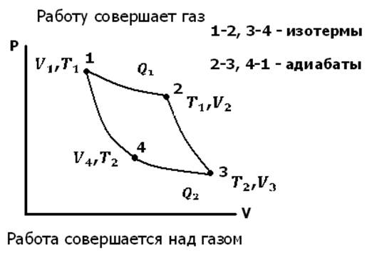 Е начало термодинамики В тепловой машине превращение тепла в работу сопровождается передачей некоторого количества тепла холодильнику. Это тепло уже не может быть превращено в работу. Одна из формулировок 2-го начала термодинамики, учитывая это, гласит: невозможен вечный двигатель второго рода, т.е. такой периодически действующий двигатель, который бы получал тепло от одного резервуара и превращал это тепло полностью в работу. Процесс, обратный рассмотренному в тепловом двигателе, используется в холодильной машине. Цикл Карно. Теорема Карно. Из различных круговых процессов в термодинамике особое значение имеет так называемый цикл Карно. Для любого рабочего тела наиболее выгодным для К.П.Д. является цикл Карно. Это процесс, при котором систему можно приводить в тепловой контакт с двумя тепловыми резервуарами, имеющими T=const (нагревателем – с