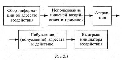 Рис.2 1 Кратко охарактеризуем каждый из блоков схемы. Сбор информации об адресате воздействия проводится с целью получения сведений, которые позволят скрыто управлять объектом. При этом, готовясь к акту управления, инициатор может подвергнуть анализу все, что ему известно об объекте, или провести специальные наблюдения, чтобы 1) сделать заключение о том, как объект воспринимает ситуацию и относится к управляющему субъекту — положительно или отрицательно; 2) оценить состояние управляемого объекта по его мимике, голосу, жестам и позам, 3) определить по характерным словам, жестам, темпу речи и интонации доминирующий канал воздействия на объект — слух, зрение, ощущения. В зависимости от доминирующего канала восприятия большинство индивидов можно отнести соответственно к одному из следующих типов: аудиалы, визуалы, кинестики, дигиталы. Различают и типы познавательной деятельности (по К Юнгу), эмоциональный, аналитический, интуитивный (ощущающий). Выявление мишеней воздействия и приманок происходит уже на стадии сбора информации об адресате. Мишени воздействия — это те особенности личности, ее потребности и желания, на которые воздействует инициатор, чтобы подтолкнуть объект к принятию нужного решения. Мишенями могут быть универсальные побудители — чувство достоинства индивида, его стремление к успеху, материальной выгоде, получению удовольствия, комфорту, желание быть здоровым, иметь благополучную семью и т п. В одном психологическом исследовании мужчинам было предложено оценить свою способность «вести дела с другими людьми». Все оценили их выше среднего, при этом 60 % опрошенных отнесли себя к лучшим 10 % совокупности, а каждый четвертый посчитал, что входят в число самых способных вэтом плане людей, составляющих 1 %. В параллельном исследовании 70 % испытуемых отнесли себя к верхней четверти по способности к лидерству и лишь 2 % посчитали, что их лидерские способности ниже средних. Даже в области, где большинству мужчин трудно обмануться, 60 % заявили, что они входят в верхнюю четверть по атлетическим данным, и только 6 % признали, что их атлетические качества ниже среднего. В других исследованиях лицам обоего пола предлагалось оценить себя по шкалам: хороший — плохой, умный — глупый, красивый — некрасивый. Подавляющее большинство респондентов сочли себя выше среднего уровня. Все это свидетельствует о том, что хорошее мнение людей о себе и, соответственно, поддержание ими своего реноме служит прекрасной мишенью для скрытого управления ими. Ту же роль в целях скрытого управления индивидом может играть присущая многим жажда прославиться, запечатлеть свое имя. В гипертрофированном виде эта потребность проявилась в поступке Герострата, сжегшего храм Артемиды Эфесской лишь с целью обессмертить свое имя. В «Ревизоре» Гоголя помещик Бобчинский имел только одну просьбу к Хлестакову: «Я прошу вас покорнейше, как поедете в Петербург, скажите всем там вельможам разным: сенаторам и адмиралам, что вот, ваше сиятельство или превосходительство, живет в таком-то городе Петр Иванович Бобчинский. Так и скажите: живет Петр Иванович Бобчинский». Мишенью воздействия нередко становится предоставляемая адресату возможность удовлетворить какую-то из своих потребностей: физиологическую, потребность в безопасности или принадлежности к какой-либ
