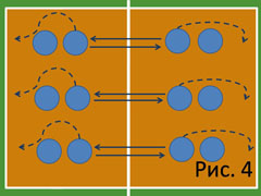 «Передал — выйди». Игроки в парах на расстоянии 4 м друг от друга из-за лицевой линии начинают передачи мяча двумя руками сверху (снизу) в движении, перемещаясь боком к противоположной линии и обратно. Побеждает та пара, которая допустила меньше потерь мяча (рис. 1). «Мяч партнеру». 6—8 игроков стоят по кругу и один в центре круга. По сигналу игроки, стоящие по кругу, передают мяч друг другу, а тот, который стоит в центре, пытается коснуться мяча. Мячи передают в различных направлениях. Центральный игрок, коснувшись мяча, становится в круг на место того, чью передачу он перехватил, а игрок из круга — на место центрального, и игра продолжается.