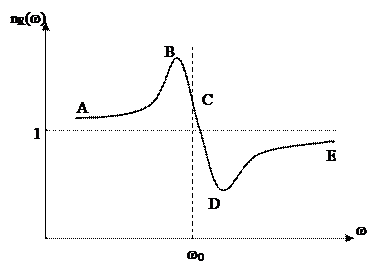 где b = 2w nI /c – коэффициент поглощения (закон Бугера). Таким образом, в данной теории содержится не только теория показателя преломления (дисперсии) вещества, но и теория поглощения света этим веществом. В тех материалах, которые обычно считаются прозрачными, величина c/w nI, имеющая размерность длины, оказывается гораздо больше толщины материала. График зависимости nR(ω)