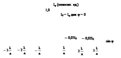 При φ = 0 все лучи, проходящие через щель, соберутся в главном фокусе линзы F. Разность хода между всеми этими лучами равна нулю, поэтому произойдет их взаимное усиление, и в точке F будет наблюдаться самый яркий центральный максимум. С ростом k ширина зон Френеля и интенсивность максимумов быстро уменьшаются. Распределение интенсивности света на экране для монохроматического света приведено на рис. 1.6.