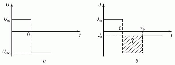 Переходные процессы в полупроводниковых диодах связаны с накоплением неосновных носителей в базе диода при его прямом включении и их рассасывании в базе при быстром изменении полярности напряжения на диоде. Так как электрическое поле в базе обычного диода отсутствует, то движение неосновных носителей в базе определяется законами диффузии и происходит относительно медленно. В результате кинетика накопления носителей в базе и их рассасывание влияют на динамические свойства диодов в режиме переключения. Рассмотрим изменения тока I при переключении диода с прямого напряжения U на обратное напряжение. На рисунке 4.20 показаны эпюры изменения напряжения и тока на диоде.