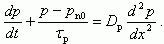 Из общих положений ясно, что в момент переключения напряжения в диоде с прямого на обратное величина обратного тока будет существенно больше, чем тепловой ток диода. Это произойдет потому, что обратный ток диода обусловлен дрейфовой компонентой тока, а ее величина в свою очередь определяется концентрацией неосновных носителей. Эта концентрация значительно увеличена в базе диода за счет инжекции дырок из эмиттера и описывается в начальный момент уравнением (4.26). С течением времени концентрация неравновесных носителей будет убывать, следовательно, будет убывать и обратный ток. За время t2, называемое временем восстановления обратного сопротивления или временем рассасывания, обратный ток придет к значению, равному тепловому току. Для описания кинетики этого процесса запишем граничные и начальные условия для уравнения (4.25) в следующем виде. В момент времени t = 0 справедливо уравнение (4.26). При установлении стационарного состояния в момент времени t → ∞ стационарное распределение неравновесных носителей в базе описывается соотношением: Обратный ток обусловлен только диффузией дырок к границе области пространственного заряда p-n перехода: