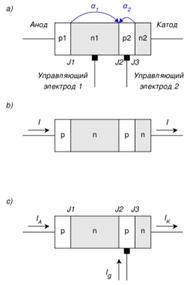 Рис. 1. Схемы тиристора: a) Основная четырёхслойная p-n-p-n-структура b) Диодный тиристор с) Триодный тиристор. Основная схема тиристорной структуры представляет собой четырёхслойный полупроводник структуры p-n-p-n, содержащий три последовательно соединённых p-n-перехода J1, J2, J3. Контакт к внешнему p-слою называется анодом, к внешнему n-слою — катодом. В общем случае p-n-p-n-прибор может иметь до двух управляющих электродов (баз), присоединённых к внутренним слоям. Подачей сигнала на управляющий электрод производится управление тиристором (изменение его состояния). Прибор без управляющих электродов называется диодным тиристором или динистором. Такие приборы управляются напряжением, приложенным между основными электродами. Прибор с одним управляющим электродом называют триодным тиристором или тринистором. В зависимости от того, к какому слою полупроводника подключён управляющий электрод, тринисторы бывают управляемыми по аноду и по катоду. Наиболее распространены последние. Описанные выше приборы бывают двух разновидностей: пропускающие ток в одном направлении (от анода к катоду) и пропускающие ток в обоих направлениях. В последнем случае соответствующие приборы называются симметричными и обычно имеют пятислойную структуру полупроводника. Симметричный тринистор называется также симистором или триаком.
