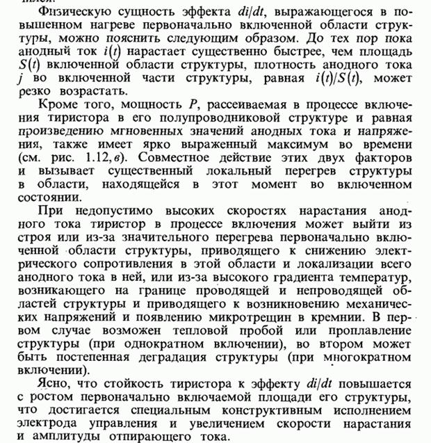 39. Эффект di/dt в тиристорах. Если ток, протекающий через тиристор в прямом направлении (в открытом состоянии) будет возрастать со скоростью более некоторой критической di/dt > diкрит/dt, то произойдёт разрушение структуры и выход тиристора из строя, что объясняется ограниченным ростом площади протекания носителей, увеличением плотности тока и локальным тепловым пробоем. Параметр diкрит/dt является справочным и указывается в каталогах на каждую модель тиристора.