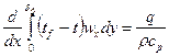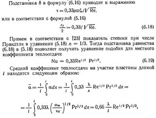 Интегральные уравнения теплового и динамического пограничных слоев при безнапорном обтекании пластины. Рассмотрим участок плоской поверхности, с температурой tw и омывается потоком несжимаемой жид-ти с темп. tf. Ширина поверхности равна 1. на расстоянии х от начала координат выделим элемент теплового пограничного слоя ABCD длиной dx (две боковые поверхности элемента образованы вертикальными плоскостями, нормальными к оси х). Тепловой баланс этого элемента при стационарных условиях теплообмена и отсутствии в жидкости внутренних источников теплоты: Qx – Qx+dx+dQ’x= dQ’’x. Два первых члена определяют изменение энтальпии теплоносителя при течении его между поверх-ми АВ и CD, третий - подвод теплоты вместе с теплоносителем, поступивший через поверх-ть ВС. Правая часть уравнения отражает теплообмен между поверхностью и теплоносителем. Величину Qx+dx найдем разложением Qx в ряд Тейлора: Qx+dx= Qx+(d Qx/dx)dxПренебрегая распространением теплоты вдоль оси х найдем: Qx= где wx – переменная по толщине пограничного слоя скорость потока.dQ’x=сptfdG’x, G’x – массовый расход вещества через поверхность ВС. dQ’x= теплота, проходящая через поверхность теплообмена: dQ’’x=qdx.Подставим все выражения в первую формулу: Считая, что теплофизические характеристики теплоносителя от температуры не зависят, выражение примет вид: . Подставив в это выражение тепловую нагрузку из уравнения Фурье, в котором температурный градиент взят по абсолютной величине, получим: Это уравнение называется интегральным уравнением для теплового пограничного слоя. Аналогично выводится уравнение для динамического пограничного слоя, (интегральное соотношением количества движения): ,