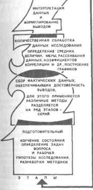 Рис. II.5. Этапы психологического исследования 2. Место проведения исследования Должно обеспечивать изоляцию от внешних помех (по меньшей мере эти влияния необходимо учитывать), отвечать санитарно-гигиеническим и ин-женерно-психологическим требовани-ям, т. е. обеспечивать определенный комфорт и непринужденную рабочую обстановку. 3- Техническое оснащение иссле- дования должно соответствовать ре- шаемым задачам, всему ходу исследо- вания и уровню анализа получаемых результатов. 4. Подбор испытуемых должен обеспечить их качественную однородность. 5. Исследователь (или экспериментатор) неизбежно влияет на ход проводимой работы на всех ее этапах, от планирования до выводов и рекомендаций. 6. Инструкция составляется еще на стадии планирования работы. Инструкция должна быть четкой, краткой, однозначной. 7. Протокол исследования должен быть одновременно полным и целенаправленным (избирательным). 8. Обработка результатов исследования – это количественный и качественный анализ и синтез полученных в ходе исследования данных. Основным принципом построения психологического исследования является принцип качественного анализа особенностей протекания психических процессов. Важно не только, сколько и какие задачи выполнил испытуемый, главное – как он работал. Каков характер ошибок? Основные методологические принципы, которые необходимо соблюдать при любом методе: метод должен исходить из диалек-тико-материалистического представления о предмете науки, отражать его специфику; научный метод психологии должен быть объективным; соблюдение генетического (эволюционного) принципа; необходимость научных обобщений с учетом индивидуальных различий. В психологии выделяются четыре группы методов (по Б.Г. Ананьеву):1 1 Ананьев Б.Г. О методах современной психологии. В кн.: Психологические методы. Л., 1976. С. 23-35. I группа – организационные методы. Они включают сравнительный метод (сопоставление различных групп по возрастам, деятельности и т.д.); лонгитюдный метод (многократные обследования одних и тех же лиц на протяжении длительного периода времени); комплексный метод (в исследовании участвуют представители разных наук; при этом, как правило, один объект изучают разными средствами. Исследования такого рода позволяют устанавливать связи и зависимости между явлениями разного типа, например, между физиологическим, психологическим и социальным развитием личности). II группа – эмпирические методы, включающие: наблюдение и самонаблюдение; экспериментальные методы, психодиагностические методы (тесты, анкеты, опросники, социометрия, интервью, беседа), анализ продуктов деятельности, биографические методы. III группа – методы обработки данных, включающие: количестенный (статистический) и качественный (дифференциация материала по группам, анализ) методы. IV группа – интерпретационные методы, включающие генетический (анализ материала в плане развития с выделением отдельных фаз, стадий, критических моментов и т.п.) и структурный (устанавливает структурные связи между всеми характеристиками личности) методы. Наблюдение (см.) обычно проводится в естественных условиях, без вмешательства в ход деятельности. Поступки и слова подробно записываются, а затем анализируются. Для научного наблюдения характерны не простая фиксация факта, а переход от его описания 