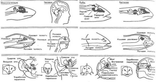 Рис. III.3. Мозг и органы чувств (ступени эволюции)