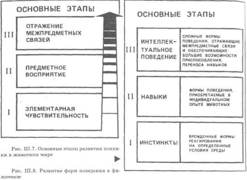 Рис. III.2. Эволюция психики (по К.К. Платонову) все большее значение начинает приобретать передний конец тела, в нем Происходит скопление и уплотнение нервных элементов – постепенно возникает головной мозг. Чувствительность (см.) возникает на базе раздражимости (см.) как всеобщего свойства живой материи. Чувствительность – первое проявление Психики и показатель ее возникновения. «Чувствительность ориентиру-ет организм в среде, выполняя сигнальную функцию» (А.Н. Леонтъ-ев), т. е. организм начинает реагиро-вать на биологически нейтральные Раздражители, лишь сигнализирующие о биологически значимых раз-ДРажителях. А.Н. Леонтьев выделяет три стадии развития психики животных. Согласно современной точке зрения (К.Э. Фабри), в пределах каждой стадии могут быть различные уровни: низший, высший, наивысший. На стадии элементарной чувствительности животное реагирует только на отдельные свойства предметов внешнего мира. На стадии предметного восприятия деятельность животного определяется воздействием уже не отдельных свойств предметов, а вещами в целом. Отражение действительности осуществляется в виде целостных образов. Стадия интеллекта (см.) характеризуется еще более сложной дея-