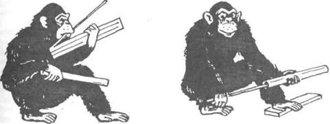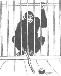 Рис. III.21. Обезьяна с помощью палки достает яблоко ми условиями. Сознание человека носит всегда целенаправленный и активный характер. Основной предпосылкой и условием возникновения сознания человека явилось развитие человеческого мозга. Становление человеческого сознания было длительным процессом, органически связанным с общественно трудовой деятельностью. Возникновение трудовой деятельности коренным образом изменило отношение человека к окружающей среде. Сказанное позволяет говорить о том, что ведущим фактором, влияющим на развитие сознания, была трудовая деятельность, основанная на совместном употреблении орудий труда. Труд – это процесс, связывающий человека с природой, процесс воздействия человека на природу.