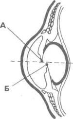 Рис. VIII.11. Аккомодация хрусталика: изменение кривизны хрусталика при рассматривании близких (А) и отдаленных (Б) предметов можность видеть все его части. Слуховые ощущения вызываются действием на слуховой рецептор звуковой волны. Звуковые волны собираются наружной частью органа слуха – наружным ухом и через наружный слуховой проход попадают на барабанную перепонку. За барабанной перепонкой начинается среднее ухо, связанное евстахиевой трубой с носоглоткой. Колебания барабанной перепонки передаются дальше через систему косточек: наковальню, молоточек и стремечко. Стремечко закрывает отверстие (овальное окно), ведущее во внутреннее ухо, где находится спиральное костное образование – улитка. В середине она разделена на два отдела, которые сообщаются между собой отверстием. Второй отдел также заканчивается отверстием (круглым окном), затянутым перепонкой. Внутри улитка заполнена жидкостью.