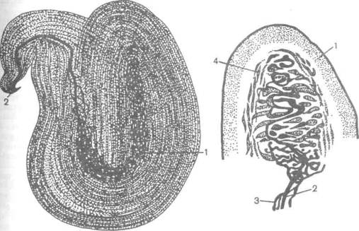 Рис. VIII.16. Полукружный канал (продольный разрез): 1 – волосковые клетки; 2 – аксоны Тембр звука – это его специфическое качество, которое отличает звуки друг от друга. Человек способен воспринимать звуковые колебания с частотой от 20 до 2000 герц. Колебания с частотой ниже 16—20 герц называются инфразвуком, с частотой свыше 2000 – ультразвуком. В пределах зоны ощущений частота колебаний определяет прежде всего высоту воспринимаемого звука: чем больше частота, тем более высоким кажется нам воспринимаемый звук. На высоту звука влияет также и интенсивность раздражителя. волосковых клеток; 3 – волоски (стереоцилии)