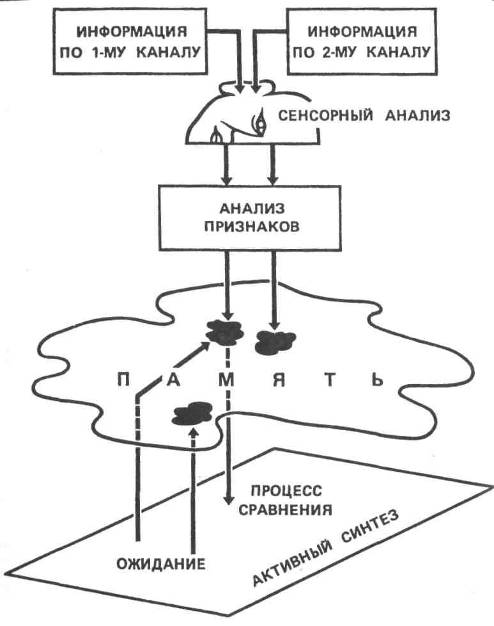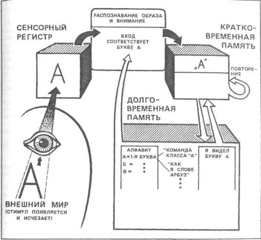 Рис. XI. 1. Модель системы переработки информации человеком ширять свои моделирующие способности. Именно благодаря этому мышление человека дает возможность познать обобщенно и опосредованно. Материальной основой мышления является речь. Мысль опирается на свернутую внутреннюю речь. Эксперименты показали, что ни одна сложная мысль не протекает без свернутых внутренних речевых процессов. Оказалось, что если зарегистрировать положение языка или органов гортани в спокойном состоянии, а затем предложить испытуемому начать придумывать любую задачу, то в речевом анализаторе начинается сложная деятельность, которую можно зарегистрировать. Следовательно,