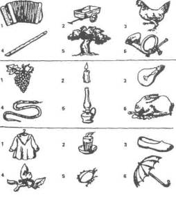 Рис. XI.8. Таблицы для исследования мышления (по Майер-Хорстону). Определите, что лишнее в каждой группе изображений? Сравнение (см.) характеризуется как более элементарный процесс, с которого, как правило, начинается познание. В ходе этого процесса субъект обнаруживает тождество и различие между вещами. С помощью анализа (см.) обнаруживаются наиболее существенные признаки. Анализ и синтез (см.) обычно выступают в единстве. Они неразрывны, не могут существовать друг без друга: анализ, как правило, осуществляется одновременно с синтезом, и наоборот. К операциям мышления относятся также абстракция (см.) и обобщение (см.). К формам мышления относятся понятие (см.), суждение (см.) и умозаключение (см.) Понятия могут быть общими и единичными, конкретными и абстрактными. Суждения могут быть истинными и ложными. Умозаключения ivioryT быть индуктивными (см.) и дедуктивными (см.). Понятие — форма мышления, которая отображает единичное и особенное, являющееся одновременно и всеобщим. Понятие выступает и как форма мышления, и как особое мыслительное действие. За каждым понятием скрыто особое предметное действие. Понятие в зависимости от типа абстракции и обобщения, лежащих в основе его познания, выступает как эмпирическое или теоретическое. Эмпирическое представление фик- сирует одинаковые предметы в каждом отдельном классе предметов на основе сравнения. Специфическим содержанием теоретического представления выступает объективная связь всеобщего и единичного (целостного и отличного). Понятия формируются в общественно-историческом опыте. Человек усваивает систему понятий в процессе жизни и деятельности. Выделение видов мышления производят по различным основаниям. Наглядно (конкретно) действенное мышление (см.) есть наиболее эле-