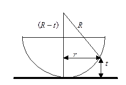 Так как при отражении света от среды с большим показателем преломления его фаза меняется на 180°, а при отражении от среды с меньшим показателем преломления его фаза не меняется, луч 1 имеет ту же фазу, что и падающий луч, луч 2 - фазу, отличную от падающего луча на 180°, что означает дополнительную разность хода между лучами 1 и 2, равную l / 2. Тогда условие возникновения темного кольца 2× t + l / 2 = (m + 1/2)×l, m = 0, 1, 2, ¼, или 2× t = l× m, где t - толщина воздушного зазора между сферической поверхностью и плоской пластинкой. Из геометрии рисунка следует. Что (R - t)2 + r 2 = R 2 r 2 - 2× t × R + t 2 = 0 так как t << R и t << r, слагаемым t 2 можно пренебречь, и в результате r 2 = 2× t × R,