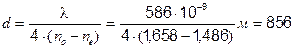 Согласно закону Брюстера отраженный луч полностью поляризован, если: tg QБ = n, где QБ - угол полной поляризации отраженного от диэлектрика света, n - показатель преломления. Для границы вода-воздух n = 1,33, отсюда QБ = 33,1°. При полной поляризации отраженного света выполняется равенство: QБ + g = 90° где g - угол преломления. g = 90° - QБ = 36,9°. Ответ: g = 36,9° 9. Какую минимальную толщину должна иметь четвертьволновая пластинка кальцита (n0 = 1,658; ne = 1,486) для света с длиной волны 589 нм? Решение При распространении луча в кристалле перпендикулярно главной оптической оси между обыкновенным и необыкновенным лучами возникает разность фаз Dj = 2×p ×d× (n o - n e) / l, где d - толщина кристалла; l - длина волны света. Четвертьволновой пластинке максимальной толщины соответствует разность фаз Dj = p / 2, или 2×p ×d× (n o - n e) / l = p / 2, откуда Ответ: d = 856 нм Date: 2015-05-05; view: 2926; Нарушение авторских прав |