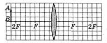 6. (3 б.) На рис. 128 зображено предмет АВ та його зображення А1В1, отримане за допомогою лінзи. Відстань між лініями сітки дорівнює 5 см. Укажіть, які з наведених твердженьправильні, а які — неправильні.