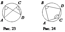 Доказательство. Легко получается из теоремы об измерении вписанного угла: Ð АВС = Ð АВС + Ð ADC = Второе равенство устанавливается аналогично. Следствие 3. Если точки А, В, С, D лежат на окружности, то Ð АВD = Ð ACD (рис. 23) или Ð АВD + Ð ACD = 180