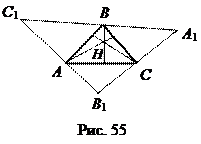 Теорема 1. Три прямые, содержащие высоты треугольника, пересекаются в одной точке. Доказательство. Через вершины треугольника АВС проведены прямые, параллельные противоположным сторонам. Тогда получим D А 1 В 1 С 1 (рис. 55). Поскольку АС 1 ВС и АВА 1 С – параллелограммы, то АС = С 1 В = ВА 1. Значит В – середина стороны А 1 С 1. Так же: А – середина стороны В 1 С 1, С – середина стороны А 1 В 1. Высоты треугольника АВС являются серединными перпендикулярами к сторонам треугольника А 1 В 1 С 1, поскольку АВ||А 1 В 1, ВС||В 1 С 1, АС||А 1 С 1. Поскольку серединные перпендикуляры D А 1 В 1 С 1 пересекаются в одной точке, то совпадающие с ними прямые, содержащие высоты D АВС, пересекаются в одной точке. Точку Н пересечения высот D АВС называют его ортоцентром. Теорема 2. Для каждого треугольника его ортоцентр Н, центр О описанной окружности и центр тяжести М лежат на одной прямой, причём ОМ: МН = 1: 2.