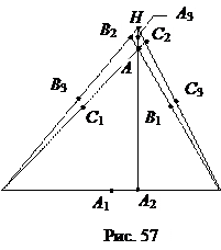 Следствие 1. Диаметр окружности Эйлера равен радиусу описанной около треугольника окружности. Действительно, окружность Эйлера можно рассматривать, как окружность, описанную около треугольника А 1 В 1 С 1 из средних линий (рис. 58). Поскольку треугольник АВС подобен треугольнику А 1 В 1 С 1 с коэффициентом подобия 2, то радиус описанной около треугольника АВС окружности вдвое больше радиуса окружности, описанной около треугольника А 1 В 1 С 1, значит он равен диаметру окружности девяти точек. Теорема 4 (Гамильтона). Если Н – ортоцентр треугольника АВС, то треугольники АВС, АВН, ВСН, АСН имеют общую окружность девяти точек. Доказательство. Пусть в треугольнике АВС: Н – ортоцентр, А 1, В 1, С 1– середины сторон, А 2, В 2, С 2 – основания высот, А 3, В 3, С 3 – точки Эйлера (середины отрезков,