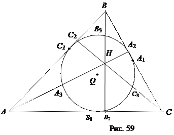 Рассмотрим гомотетию Прямую, которой принадлежит ортоцентр треугольника, его центр тяжести и центр описанного круга, называют прямой Эйлера. Теорема 3. Для любого треугольника АВС середины его сторон и основания высот лежат на одной окружности, которая делит пополам отрезки от вершин треугольника до ортоцентра. Центр этой окружности лежит на прямой Эйлера и делит пополам отрезок между ортоцентром Н и центром О описанного круга. Середины отрезков от вершин до ортоцентра называют точками Эйлера. Доказательство. Пусть А 1, В 1, С 1 – середины сторон треугольника АВС (рис. 57), А 2, В 2, С 2 – основания его высот, А 3, В 3, С 3 – середины отрезков АН, ВН, СН, где Н – ортоцентр. Будем иметь: А 1 В 1 ||АВ и А 1 В 1 = А 1 В 3 ||НС и А 1 В 3 = А 3 В 1 = Так же доказывается, что А 1 С 1 А 3 С 3 – прямоугольник. Поскольку отрезки А1А3, В1В3 и С1С3 являются диагоналями этих прямоугольников, то они пересекаются в одной точке Q. Поэтому точки А1, В1, С1, А3, В3, С3 лежат на одной окружности с центром Q. Точка А 2 находится на этой окружности, поскольку Ð А 1 А 2 А 3 = 90°. Так же устанавливаем, что В 2 находится на окружности с диаметром В 1 В 3, а С 2 – на окружности с диаметром С 1 С 3, т.е. на одной и той же окружности. Центр Q этой окружности находится на серединном перпендикуляре к хорде А 1 А 2, который делит пополам отрезок ОН, где О – центр описанной около треугольника АВС окружности. Действительно, А 1 О ^ ВС, А 2 Н ^ ВС, поэтому перпендикуляр к А 1 А 2 делит пополам отрезок ОН, будучи параллельным А 1 О и А 2 Н. Так же серединный перпендикуляр к хорде В 1 В 2 содержит центр Q окружности и проходит через середину отрезка ОН. Значит, Q – середина ОН. Окружность, которая проходит через середины сторон треугольника, основания его высот и делит пополам отрезки от вершин до ортоцентра, называется окружностью девяти точек, или окружностью Эйлера.